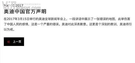 3月16日,奥迪中国官方发表声明:在2017年3月15日举行的奥迪全球新闻年会上,一段讲话中展示了一张错误的地图,此举伤害了中国人民的感情,这是一个严重的错误。奥迪对此深表歉意。这更是个深刻的教训,奥迪将引以为戒。