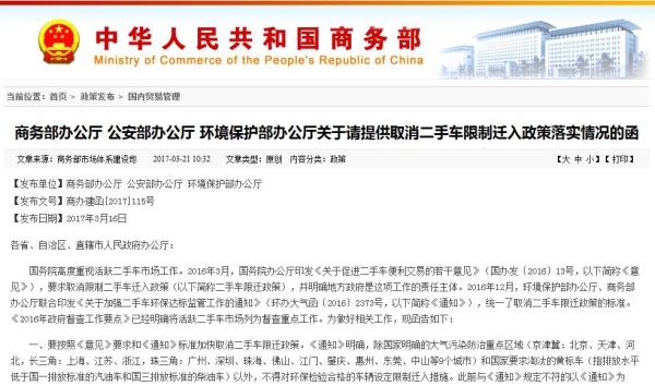 商务部办公厅、公安部办公厅、环境保护部办公厅联合发布通知,请各地区(北京、天津、河北、上海、江苏、浙江除外)在2017年4月14日前将取消二手车限迁政策落实情况和《取消二手车限迁政策情况表》分别报商务部、公安部、环境保护部。
