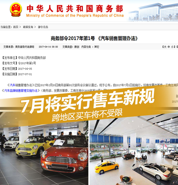 《汽车销售管理办法》已经2017年2月20日商务部第92次部务会议审议通过,并于2017年4月5日发布,自2017年7月1日起施行。经商发展改革委、工商总局同意,《汽车品牌销售管理实施办法》(商务部、发展改革委、工商总局令2005年第10号)同时废止。