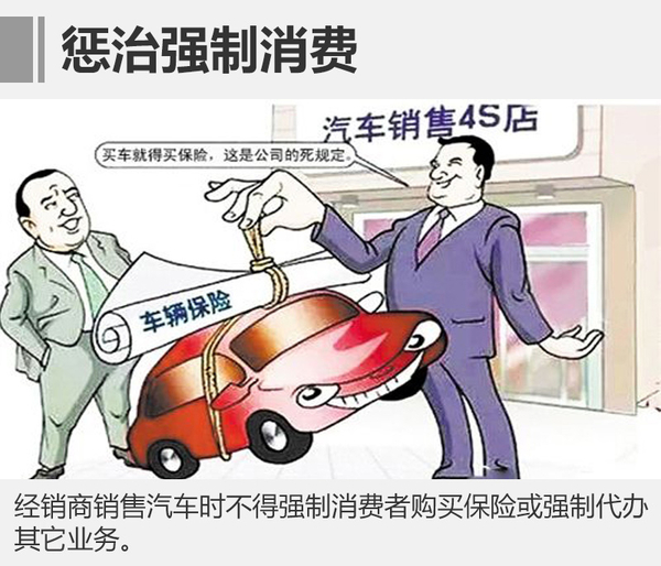 另外根据第十四条规定,经销商销售汽车时不得强制消费者购买保险或者强制为其提供代办车辆注册登记等服务。