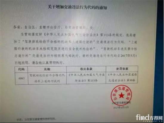 近日,公安部交通管理局向全国下发了《关于增加交通违法行为代码的通知》。《通知》指出,为贯彻落实《中华人民共和国大气污染防治法》第113条规定,公安部交通管理局增加了“驾驶排放不合格的机动车上道路行驶的”交通违法行为代码。“上道路行驶的机动车未按规定期限进行安全技术检验的”、“驾驶机动车违反禁令标志通行的”交通违法行为按照原代码执行。新的交通违法行为代码自2017年5月1日起启用。