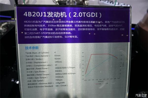 广汽展示出第二代的2.0T发动机,这款发动机相比GS8的最大不同是采用了缸内直喷。其最大功率180kW/5000-5250rpm,最大扭矩380N·m/4000rpm,压缩比为10.0:1。这台发动机数据上达到现在主流合资品牌的水平。扭矩也跟第三代EA888相同。