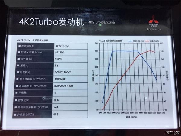 三菱在汽车业中几乎只剩下SUV和商用车业务,但三菱还是默默支持国内品牌的发展。航天三菱推出了4K2系列,其中有1.8T、2.0T、2.4T和2.0L、2.1L以及2.4L。2.4T动力最强,最大功率160kW/5600rpm,最大扭矩320N·m/2000-4400rpm。整体动力相当可观。整体技术并没有多么先进,只是歧管喷射,压缩比也是9.6,进排气双VVT、平衡轴、低惯性涡轮等等。
