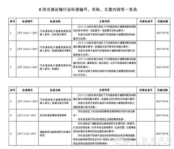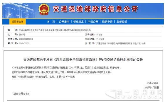 近日,交通运输部发布了《汽车维修电子健康档案系统》等6项交通运输行业标准的公告。其中包括汽车维修电子健康档案系统总体技术要求、数据采集技术要求、数据元和数据交换与共享4个部分的标准,同时还有机动车维修费用结算清单与道路客货运输驾驶员行车操作规范的标准。此次公布的6项标准将于2017年7月1日起开始实施。