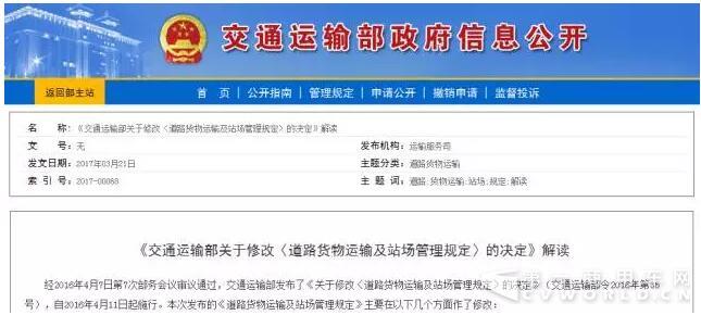经2016年4月7日第7次部务会议审议通过,交通运输部发布了《关于修改〈道路货物运输及站场管理规定〉的决定》(交通运输部令2016年第35号),自2016年4月11日起施行。本次发布的《道路货物运输及站场管理规定》主要在以下几个方面作了修改: