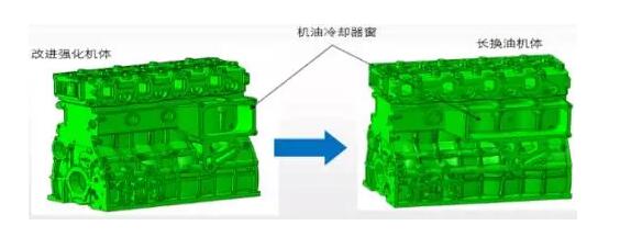由下图可见,发动机的机体结构更加优化,机油冷却器更大更强悍了。这意味这更优的冷却能力,进一步提升柴油机性能及可靠性。