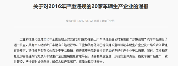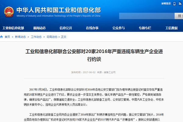 据工信部官网提供的信息显示,工信部已联合公安部对这20家2016年严重违规车辆生产企业进行了约谈,要求企业进一步落实主体责任,强化车辆产品生产一致性管控,严格做到诚信自律,确保合格产品出厂,保障道路交通安全。
