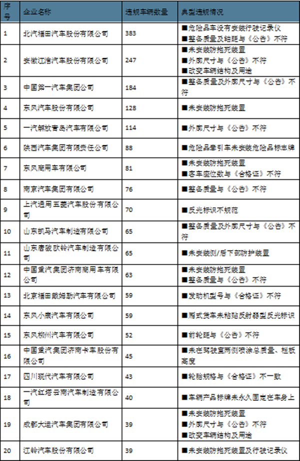 在被通报的20家企业中,北汽福田、安徽江淮和中国一汽违规车型数量最多,分别为383、247和184辆。
