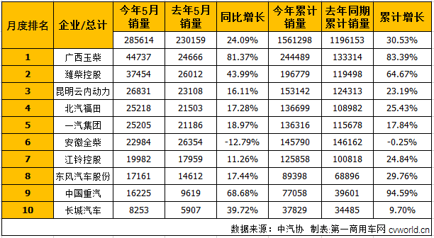 从累计销量来看,2017年1-5月的车用柴油机市场一片红火,累计增长30.53%。5月销量前十企业仅有排名第6的安徽全柴遭遇下滑,累计下降了0.25%;增幅最高的重汽和玉柴两家企业累计增幅分别达到了94.59%和83.39%,潍柴的累计增幅也达到64.67%;实现增长的9家企业仅有长城汽车一家企业累计增幅为个位数,前5月累计增长9.70%。