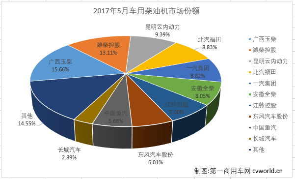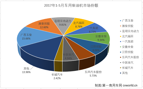 根据中汽协会最新产销快讯,2017年5月,国内车用柴油机市场销售285614台,同比增长24.09%,增幅较上月(+20.85%)有所扩大,环比4月下降10.06%。5月份车用柴油机市场持续表现良好,这个从2016年四季度开始的良好态势还在继续。其主要驱动力,源于国内重卡市场因为治超新政策所带来的新车销售火爆形势(今年前5月,重卡市场销量均超过了8万辆,3、4月销量更是双双超过了10万辆,5月份虽有所回落,但也交出了97704近10万辆的成绩单,同比增幅也是达到了50.71%)。与此同时,国内轻卡行业整体表现也不错,5月份,轻卡市场销售13.42万辆,同比增长10.20%,今年前5月份累计增长了9.83%。增幅较重卡市场小了很多,但市场体量大,因此也为柴油发动机市场贡献了不少增量。