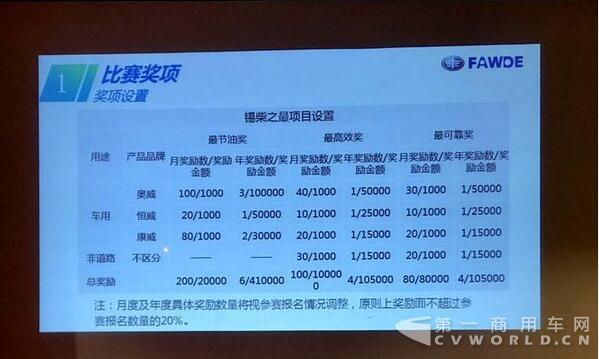 当然一个产品的好坏是用户决定的,为此锡柴开展“发现·芯无止境”锡柴之最全国大赛,最节油、最可靠、最高效三类奖项的评选,今年的最高奖项是10万元的奖金。康威4DW-E5平台用户也具备参赛资格。相信通过这次比赛能最大程度调动用户对新产品了解的积极性。