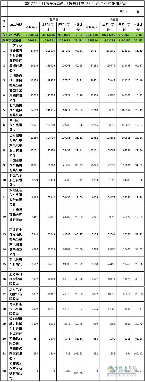 2017年5月份汽车用柴油机生产量共完成生产266631台,累计增长25.54%; 销量285614台,累计增长30.53%。销量排名前三的企业为潍柴控股集团有限公司、广西玉柴机器集团有限公司、北汽福田汽车股份有限公司。