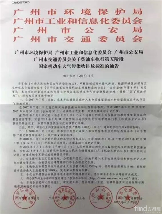 2017年6月26日广州市环境保护局、广州市工业和信息化委员会、广州市公安局、广州市交通委员会联合发布了《柴油车执行第五阶段国家机动车大气污染物排放标准的通告》。正式确定了广州将在7月1日起重型柴油车正式切换到国五。