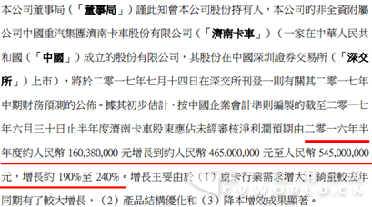 随后中国重汽继续强调业绩,在收盘后发布旗下非全资公司——济南卡车的盈利预告称,2017年上半年净利润增长幅度更加爆炸,高达190%至240%。