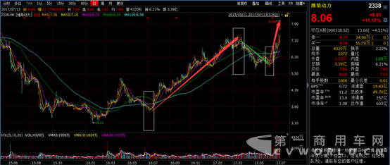 而就在同一日,中国重汽2017年上半年重型卡车产、销量分别为6.41万辆、6.56万辆,分别同比增长77%、78%的消息也进入大众视野,同样是7月13日,公司股价开盘后便稳步飙升,最终收涨至同样幅度的11%。