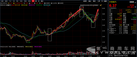 因此,中国重汽股价自2016年7月阶段底部的3.1港元平台,至2017年3月高点时涨幅已有近115%,潍柴动力在该段期间涨幅近105%。