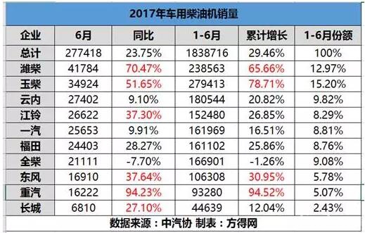 2017年上半年的车用柴油机市场如同重卡市场一样红火。