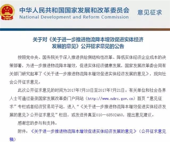 2017年7月10日国家发展改革委经济贸易司发布了《关于进一步推进物流降本增效促进实体经济发展的意见》公开征求意见稿。