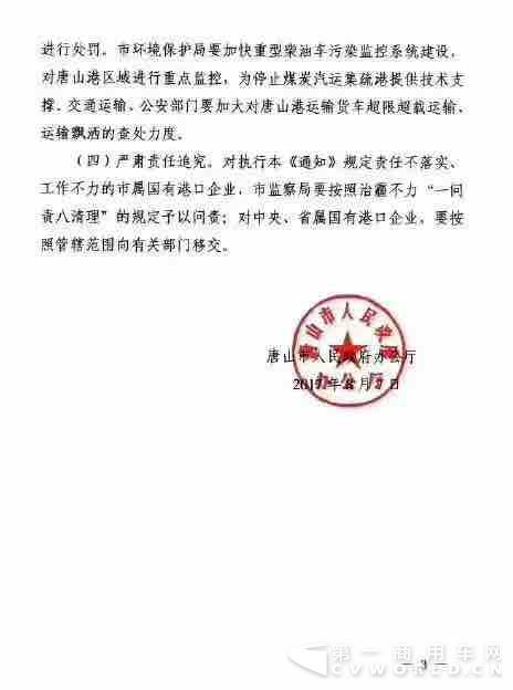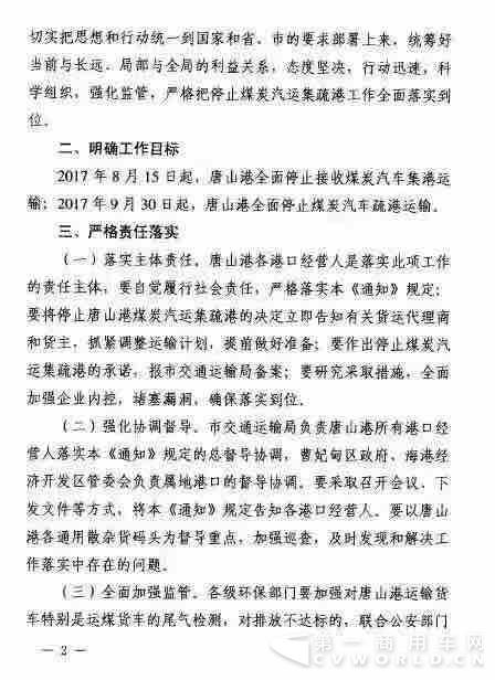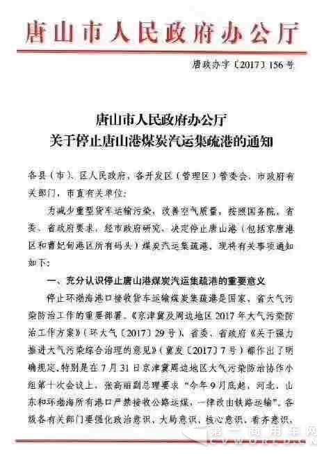 8月9日,唐山市人民政府办公厅正式发布《关于停止唐山港煤炭汽运集疏港的通知》(下称《通知》)。根据《通知》内容,为减少重型货车运输污染,改善空气质量,唐山市决定停止唐山港(包括京唐港区和曹妃甸区所有码头)煤炭汽运集疏港。具体明确目标为:2017年8月15日起,唐山港全面停止接收煤炭汽车集港运输;2017年9月30日起,唐山港全面停止煤炭汽车疏港运输。