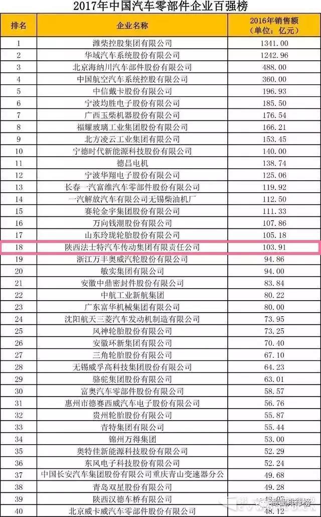 日前,“2017年中国汽车零部件企业百强榜”正式发布。本次评选以2016年汽车零部件企业营业收入为主要评价依据。法士特以良好的生产经营业绩荣登百强榜单,充分展示了其在中国汽车零部件行业的雄厚实力。