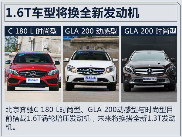 北京奔驰C 180 L、GLA 200动感型与时尚型三款车型目前搭载1.6T涡轮增压发动机,最大功率为115kW,峰值扭矩250Nm。全新1.3T发动机预计将拥有缸内直喷、多点喷射与可变气门升程等多项技术,可有效提升燃油经济性。