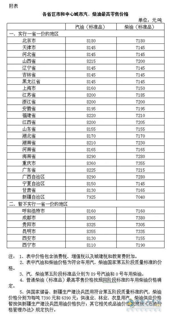 根据近期国际市场油价变化情况,按照现行成品油价格形成机制,自2017年11月2日24时起,国内汽、柴油价格(标准品,下同)每吨均提高150元。调整后,各省(区、市)和中心城市汽、柴油最高零售价格见附表。相关价格联动及补贴政策按现行规定执行。
