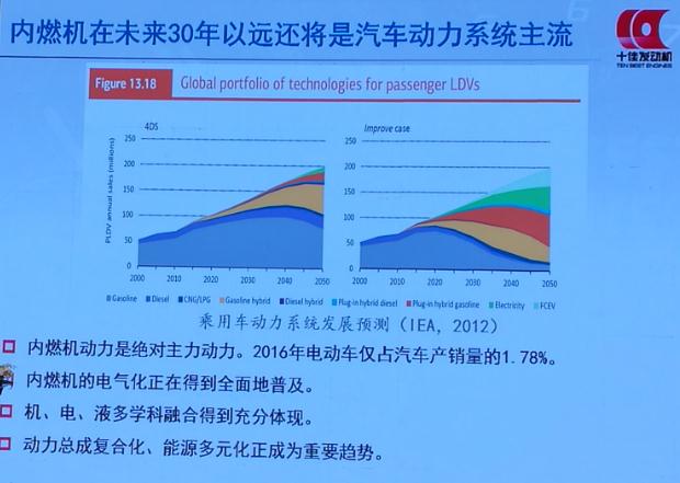 引领国际电动汽车发展的是中国。2016年中国电动汽车产量为50.7万辆,接近全球产量的50%,全世界有一半电动汽车由中国制造,按2016年汽车产销量2800多万辆计算,电动汽车占比为1.78%,不到2%的电动车能马上就把98%的传统燃油车给推掉?不大可能。所以内燃机是有生命的发动机,而且一直在进步。电气化是内燃机发展的重要方向,电气化目前正在得到全面的普及应用。此次获奖的十佳发动机,是机电液多学科在发动机上全面融合的充分体现。