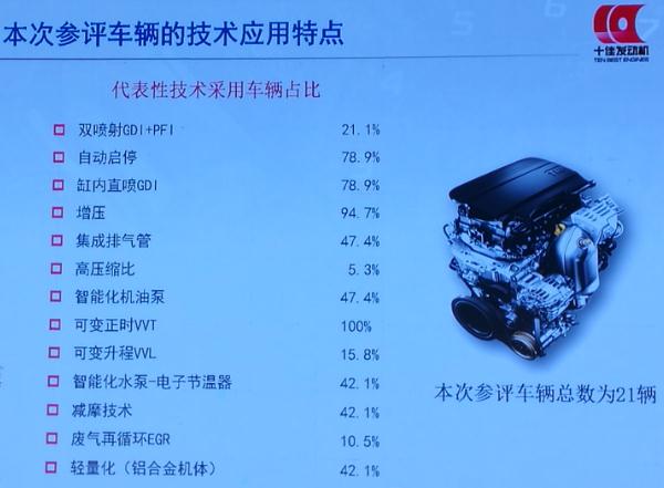经数据统计,参评车辆采用上述代表性技术比例分别为:双喷射(GDI+PFI)21.1%,自动启停78.9%,缸内直喷GDI 78.9%,增压94.7%,集成排气管47.4%,高压缩比5.3%,智能化机油泵47.4%,可变正时VVT 100%,可变升程VVL 15.8%,智能化水泵-电子节湿器42.1%,减摩技术42.1%,废气再循环EGR 10.5%,轻量化(铝合金机体)42.1%。姚春德表示,在现代发动机中,一定会有电动单元控制,如果只靠机械用链轮拖行不通,什么时候控制和怎么控制,都要靠电气实现。发动机的电气化,在此次参评发动机里得到了充分体现。