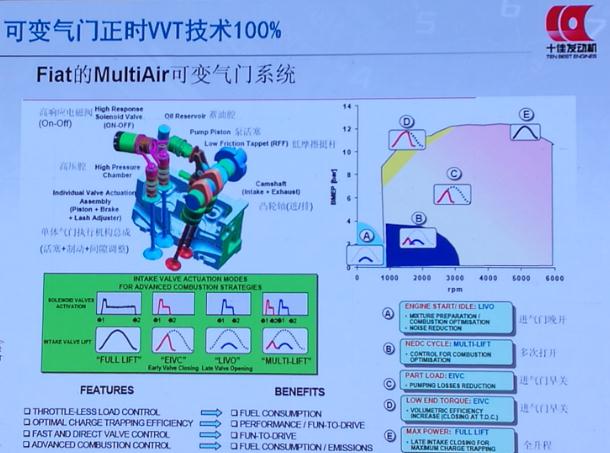 针对可变正时技术,姚春德特别介绍了Fiat的MultiAir可变气门系统。他表示,机电液一体化的可变气门系统只有这一家。参评车辆里有辆吉普车安装了MultiAir可变气门系统,在直道上行驶,将油门踩到底一直加速,是1.4排量发动机里唯一可达到140公里速度的,动力性和表现都非常出色。根据不同的负荷,可以适时调整气门升程和改变正时。