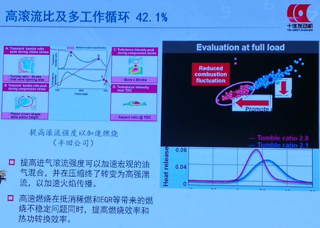 有近半的参评发动机采用了高滚流比及多工作循环系统,该系统可以通过提高进气滚流强度来加速宏观的油气混合,并在压缩终了转变为高强湍流,从而加速火焰传播。高速燃烧在抵消稀燃和EGR等带来的燃烧不稳定问题的同时,提高了燃烧效率和热功转换效率。