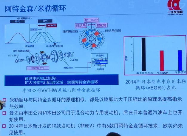 此次阿特金森/米勒循环技术在有些发动机上得到很好的体现。据姚春德介绍,阿特金森循环和米勒循环两者有所不同,上汽采用了米勒循环,丰田公司采用了阿特金森循环。阿特金森循环出现于19世纪,由于该系统多了一个连杆,工作起来很复杂,虽然可以实现低压缩比且热效率更先进,但因为很复杂所以没有得到应用。米勒循环与此不同,在1947年才正式得到应用,那时由于高增压发动机已出现,遇到非常难克服的问题,就是机械负荷增加到很大。米勒提出,可以早关进气门,来将有效压缩比减小,从而降低机械负荷。最终得到的效果都一样,通过低压缩比和高膨胀比,来实现高的发动机效率。