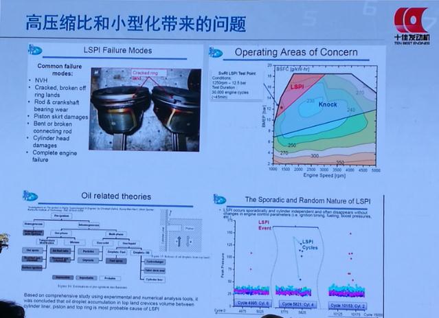 姚春德指出,目前压缩比和小型化带来的问题是比较大的。据介绍,中石油研究能抗LSPI的润滑油,即合成润滑油,研究做了很长时间。如果爆震发生时间较长,活塞会被弄坏。大量的研究结果表明,爆震发生在低速高负荷的时候,所以叫LS(low speed),低速的时候,PI就是早燃,还没有点火,爆震就发生了。即使改变冷却水的温度、材料或燃料,各种情况都做了,仍然有此情况出现,且完全是随机的。