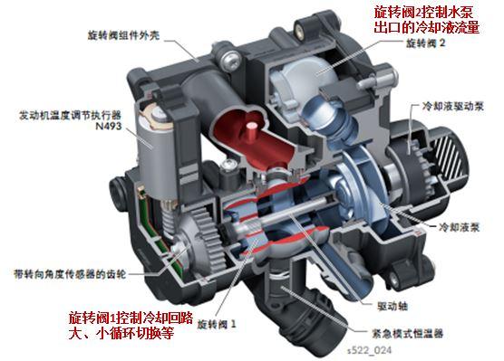 为更好地实现发动机的温度分区控制,国际上主流汽车公司重点开发先进的热管理控制方式,如发动机热管理模块、离合水泵、电子节温器等技术,已经在新发动机产品开发中获得广泛应用,如大众、通用公司等。下图是目前大众公司重点推出的发动机热管理模块内部结构图,其中主要通过两个旋转阀实现发动机盖冷却液流量调节,其中旋转阀1控制冷却系统大、小循环之间切换,旋转阀2能够通过控制水泵出水口的流通面积,实现冷却液流量大小的控制,如暖机时刻最开始需要实现冷却液零流量,可以将旋转阀2暂时完全关闭,冷却水泵空转,冷却液不能进入到发动机,实现发动机水温、机油温度的快速升高。