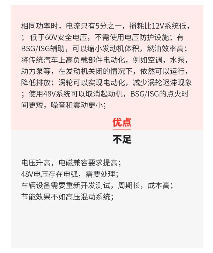 从表看出,想要达到4.0L每百公里油耗,单纯提高内燃机效率的做法显然不现实,汽车混动化,电动化是最好的出路。纯电动化汽车虽然是国际趋势,但是由于成本高和配套设施,续航的问题,短期内无法大量普及,但是48V混动系统相比高压混动系统来说,成本低,达到70%的节能效果。