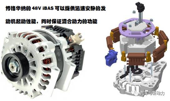 博格华纳的技术范围广泛,包括其创新的自动起停系统,如集成带交流发电机启动器(iBAS)、高性能的充电系统,如电动增压压缩机、还有先进的双轴混合动力模块等。目前已经利用了这些电力系统,供应用于P2型混合动力模块中。配备有整合模块的电力电子的交流发电机中的iBAS除了提供快速和安静的发动机起动,其混动的配置功能则大大提高了燃油经济性。配备iBAS的电动机高效地产生能量,增加扭矩,促进再生制动。
