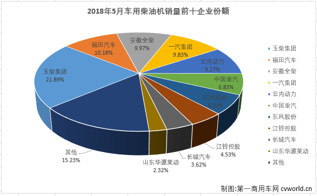 由上表可见,今年5月份车用柴油机市场同比下降10%(剔除2017年5月份潍柴销量,实际约增长4%)。具体到5月销量前十企业来看,7增3降,增长的7家企业中增幅最高的是5月份跻身月销量前十的山东华源莱动,同比增幅达到42%,排名稳居首位的玉柴5月份也收获26%的不错增幅。遭遇下滑的3家企业中,降幅最高的是江铃,同比下滑了41%,江铃的月度增幅连续在销量前十企业中垫底。