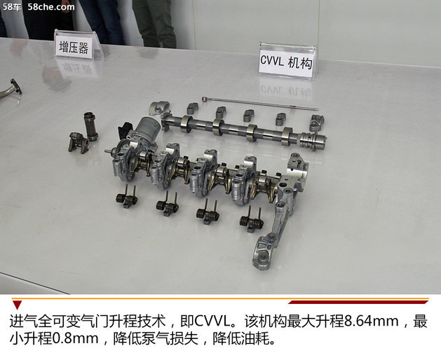 进气全可变气门升程技术,即CVVL。该机构最大升程8.64mm,最小升程0.8mm,进气门实现连续可变气门升程控制,在双VVT基础上进一步降低泵气损失。在部分负荷工况通过采用小升程及提前小升程相位,最高降低油耗8.4%(城市道路工况)。