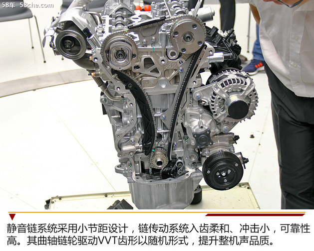静音链系统采用小节距设计,链传动系统入齿柔和、冲击小,可靠性高。其曲轴链轮驱动VVT齿形以随机形式,提升整机声品质,而且优化针对齿形和链片,消除链条系统的高阶频次噪声。此外,正时链条采用了圆弧背面,优化链片,降低摩擦,提升强度。