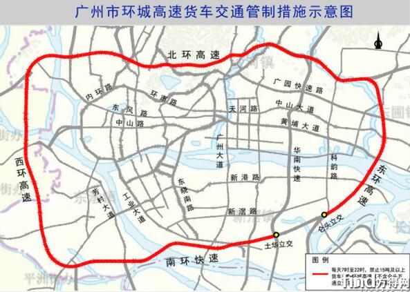 一、每日7时至22时,禁止15吨以上货车(指核定载质量、牵引质量为15吨及15吨以上的货车、牵引车)通行S81广州环城高速(含北环高速公路和东南西环城市快速路,但不含东南西环城市快速路仑头互通立交至土华互通立交路段)。