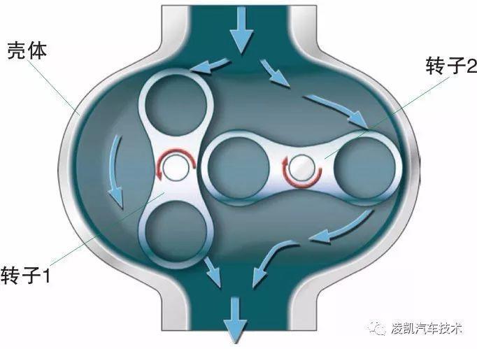 它是一种旋转活塞式结构的装置。该装置采用挤压原理工作,内部并无压缩过程。该增压器有一个壳体,壳体内有两个轴(转子)在转动。这两个转子采用机械方式来驱动,比如采用曲轴驱动。这两个转子是由壳体外的齿轮来传动的(传动比相同),两个转子同步转动,但旋向相反。于是两个转子工作起来就像在“彼此啮合”。