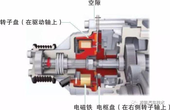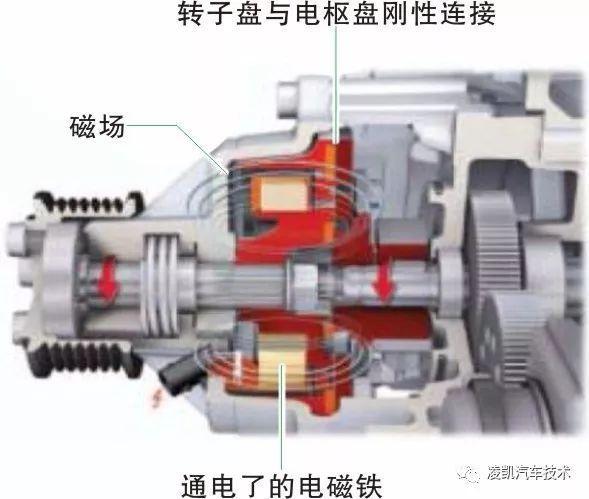 电磁离合器由发动机控制单元通过PWM 信号促动(电流调节)。电磁力克服片簧力将衔铁盘拉到转子盘的摩擦片上。摩擦建立,压缩机的转子被驱动。