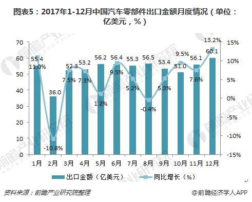 从月度汽车零部件出口金额同比变化情况来看,2月、8月出口金额同比有所下降,其他各月均呈增长,但除1月和12月外,各月增速均低于10%。