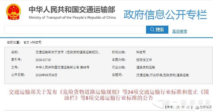 9月6日,中华人民共和国交通运输部发布公告,《危险货物道路运输规则》等34项交通运输行业标准(2018年第3批)业经审查通过,现予发布。发布的标准均为推荐性标准,由人民交通出版社出版。