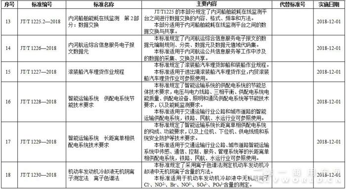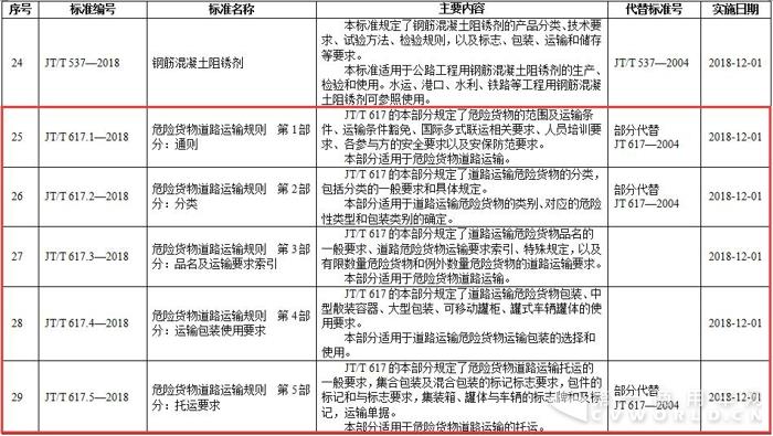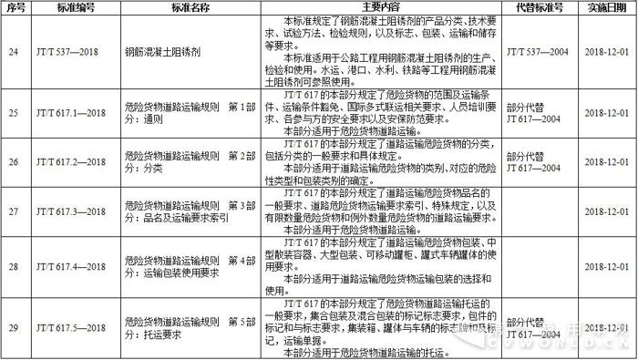 小编注意到,此次新发布的34项交通运输行业标准将于今年的12月1日正式实施。对于大家比较关心的《危险道路货运运输准则》的行业新准则,小编进行了重点摘取,方便大家浏览(一共涉及7条标准):