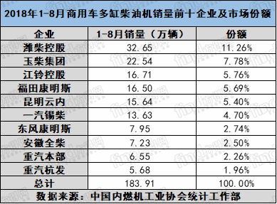 前8月,在多缸柴油机市场,潍柴占据了16%的份额,同比去年增长近3%。潍柴也是8月唯一一家份额连续增长的企业。其中,潍柴商用车多缸柴油机销量32.65万台,份额占11.26%,远超第二名。