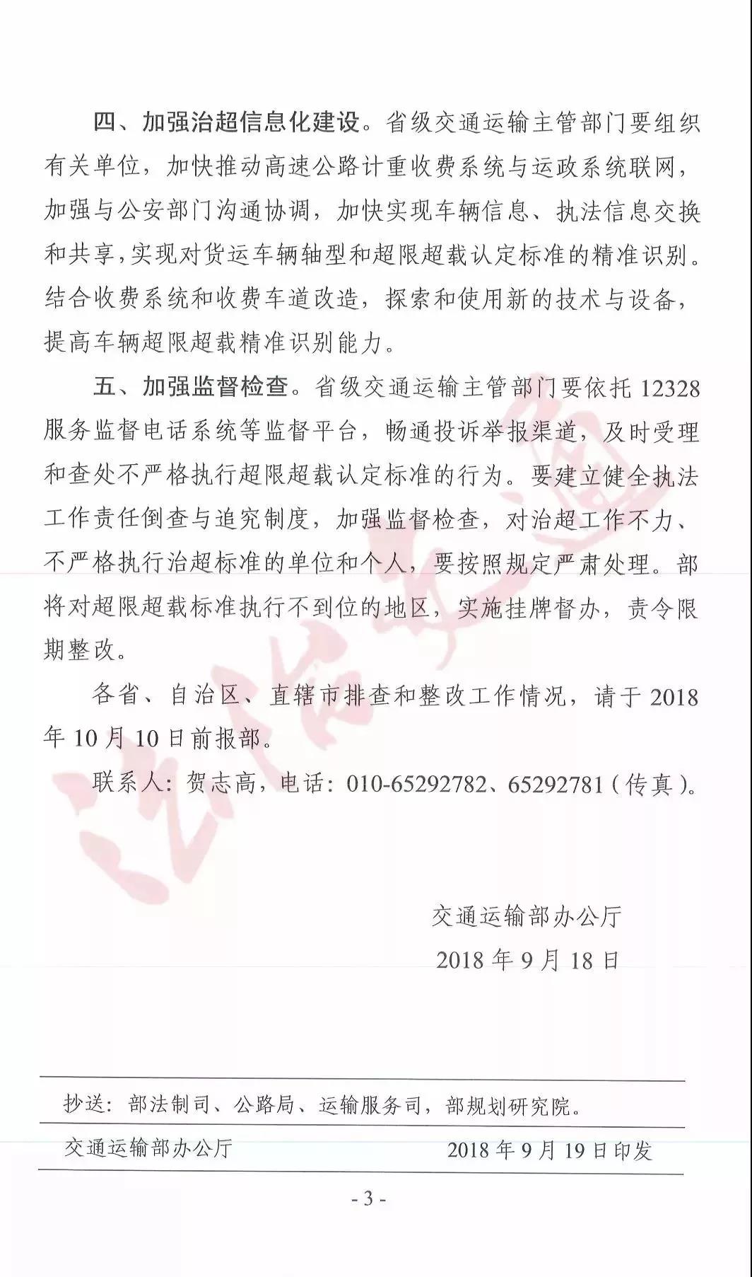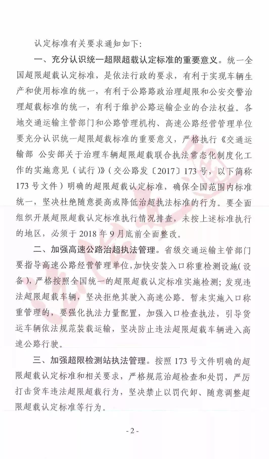 为进一步规范公路治超执法,营造公平有限营商环境,经交通运输部同意,现就严格执行全国超限超载认定标准有关要求通知如下: