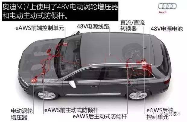 但目前48V电压只在部分电气设备上使用,例如奥迪SQ7在电动涡轮增压器和电动主动式防倾杆上使用了48V电压,而奇瑞瑞虎7则只在启发电一体机上加载了48V电压。