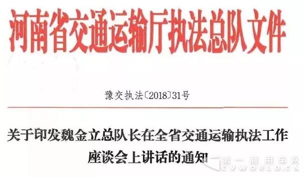 10月21日,河南省交通运输厅执法总队印发《魏金立总队长在全省交通运输执法工作座谈会上讲话》,要求各地交通运输执法执法大队学习研究,部署年底前重点工作,进一步落实超限超载治理工作,重点剿灭“百吨王”,彻查“保护伞!”