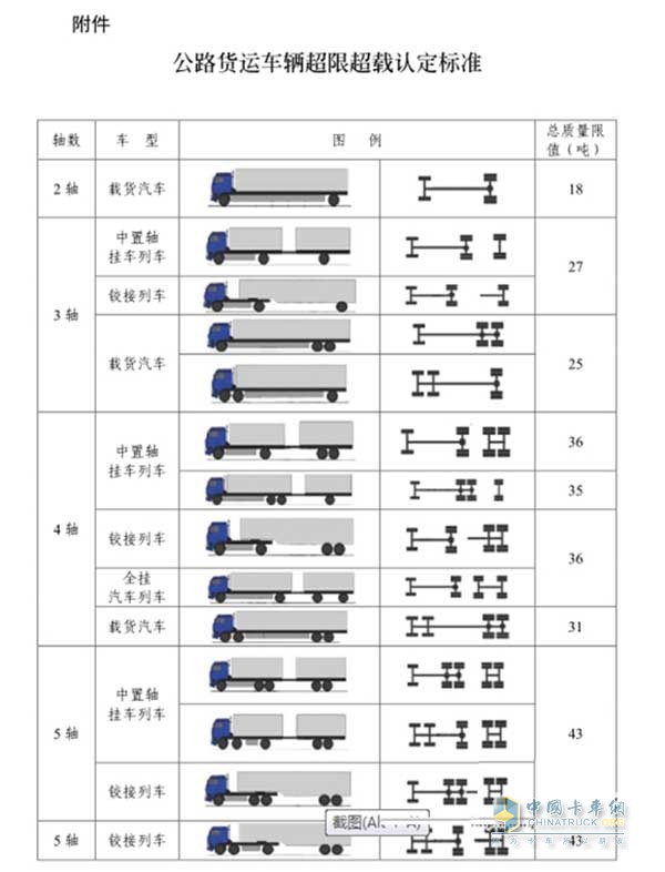 据介绍,之前超限认定标准主要根据车辆轴数、轮胎数确定,新的调整标准中,增加了驱动轴的个数、空气悬架等认定因素。调整后的标准为:
