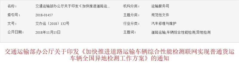 为促进物流降本增效,切实提升行业服务水平,加快推进道路运输车辆综合性能检测全国联网,实现普通货运车辆全国范围异地检测,近日,交通运输部发布《加快推进道路运输车辆综合性能检测联网 实现普通货运车辆全国异地检测工作方案》。